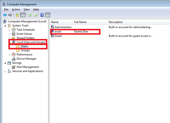 2. Manage تي ڪلڪ ڪرڻ سان Computer Management جو ڊائلاگ باڪس کلي پوندو. System tool مان Local Users and Groups>> Users. تي ڪلڪ ڪريو.